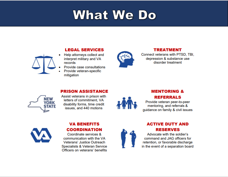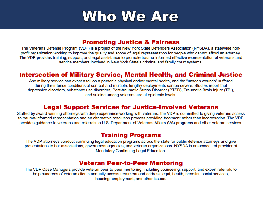 The VDP’s services promote trauma-informed and client-centered representation of veterans and service members who are suffering from the invisible wounds of war and are involved in New York State's criminal and family court systems.